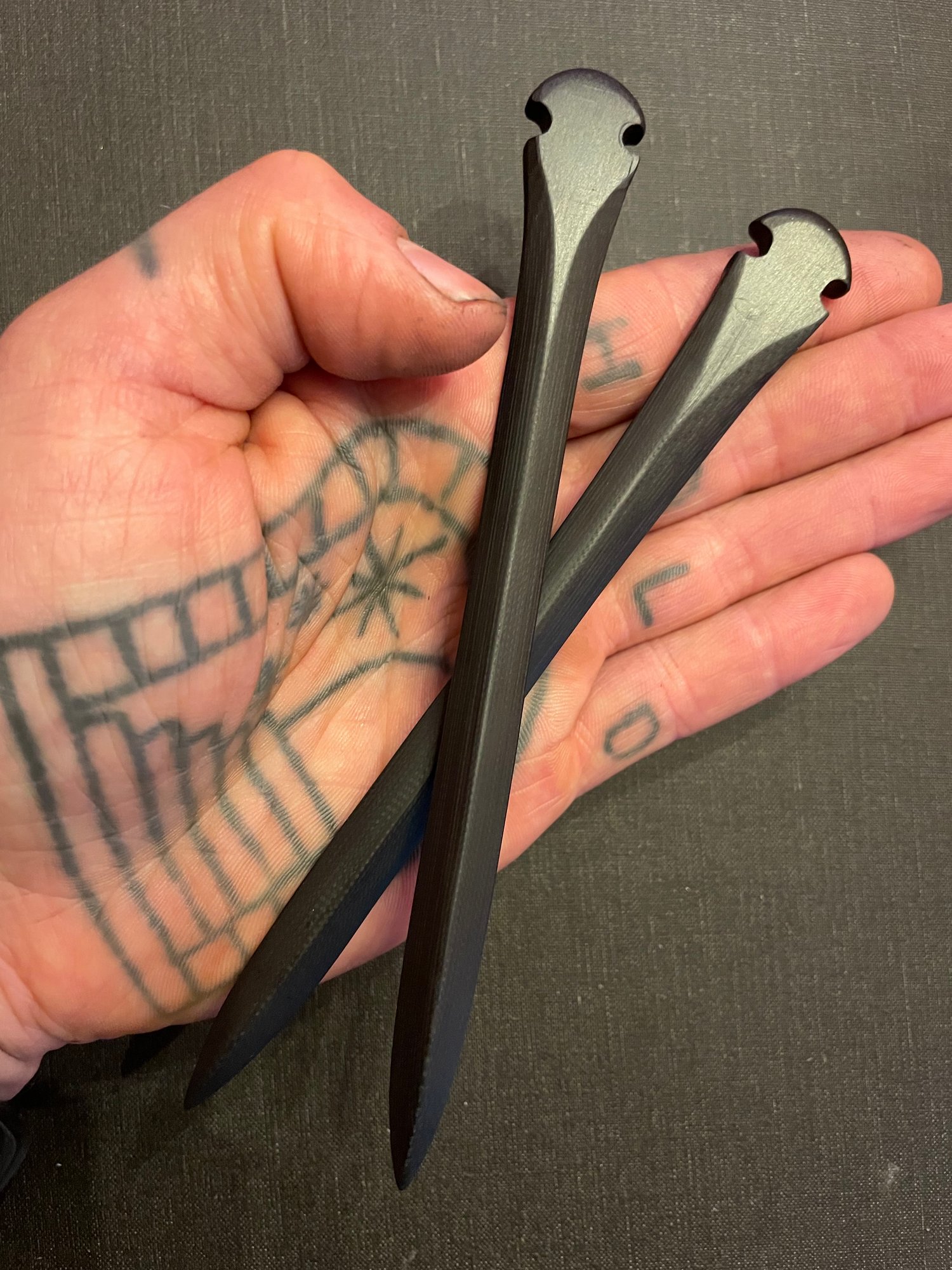 Nonmetallic, non-conductive hair sticks. Identical to the steel version, but made from Norplex G10. Safe edges, but pointy enough to easily penetrate a leather jacket. Extremely lightweight. Put your hair up in a bun. Put holes in things. They’re useful.