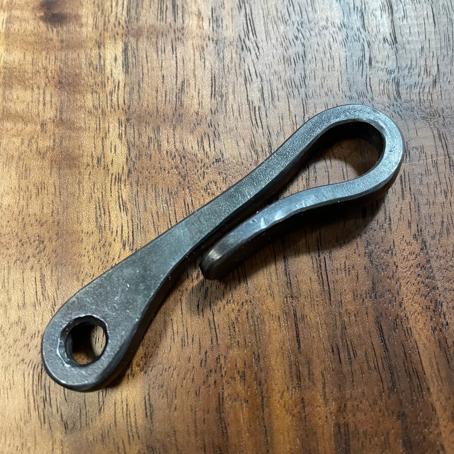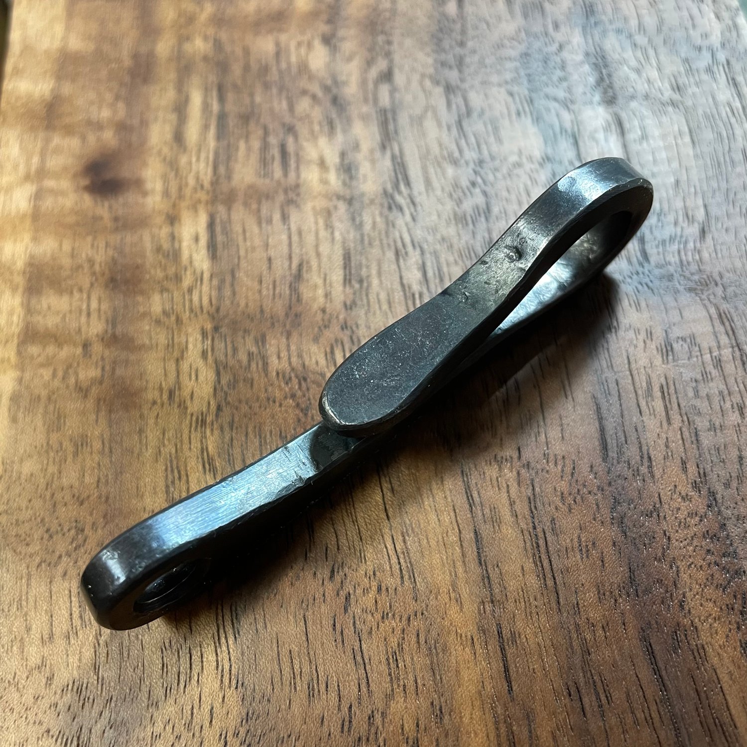 A simple belt loop or pocket-carry key hook, forged from 1084 high carbon tool steel. Hardened and tempered just like a knife or other hard use item, this will last forever and withstand more abuse than you can dish out. Sent out blued and lightly oiled, with a matching quick link and a length of 550 paracord.